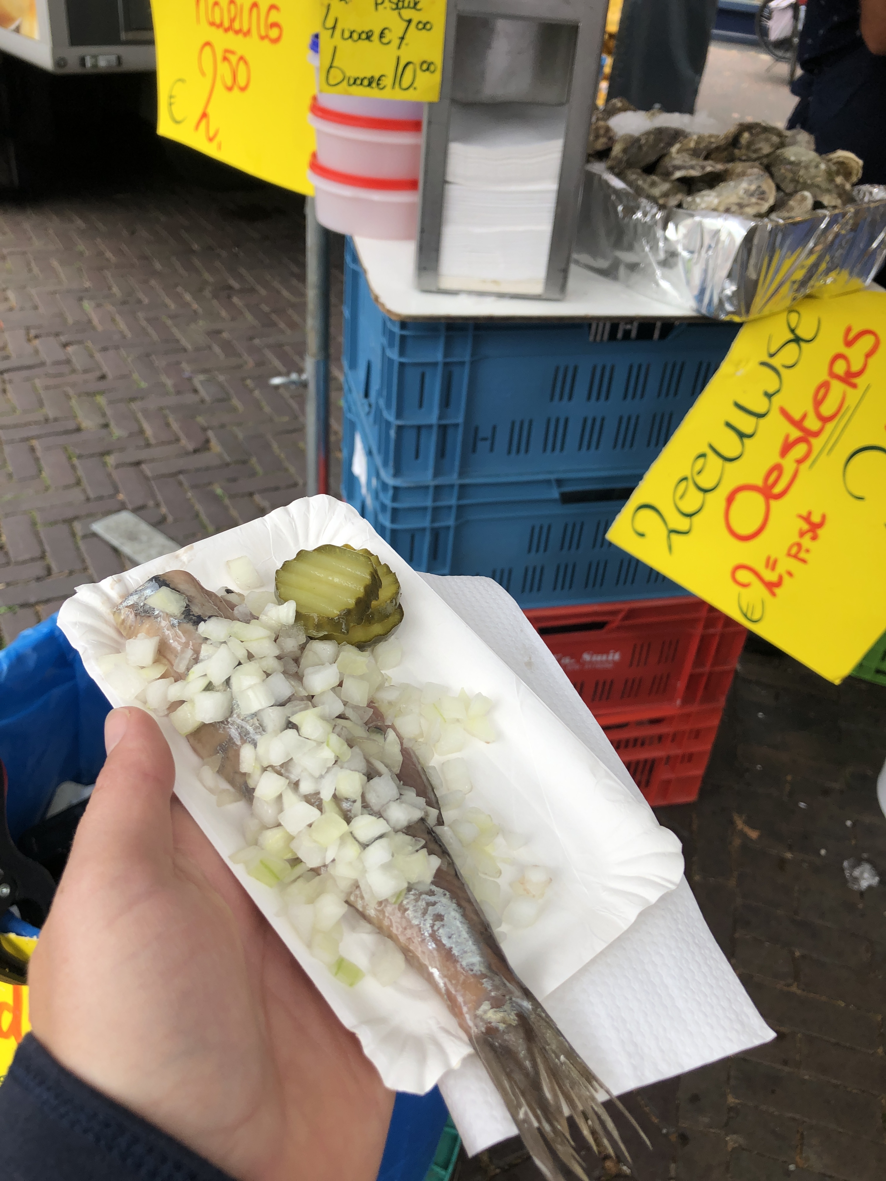 No trip to the Delft market is complete without dangling a Haring in your mouth. And watching elderly Dutch people dangling Haring into their mouths. I don’t use the term “dangle” lightly here. They really do dangle it, tilting their head fully back, coating the Haring with onion, and dipping it vertically into their mouths. It is quite a thing to witness.